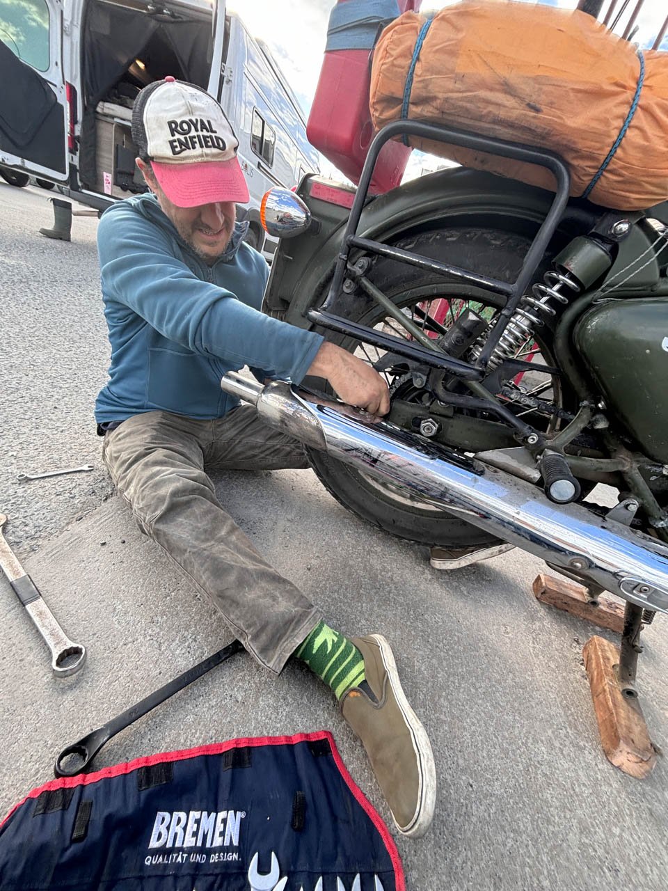 Like a good luck ritual, I kicked off the day with mate at the camp table, Frankie parked right next to me. After the heat and punishment of the previous day, she needed some attention. A quick check revealed she was just a bit low on oil. Chain lubed, bolts tightened, oil topped up, we were ready.