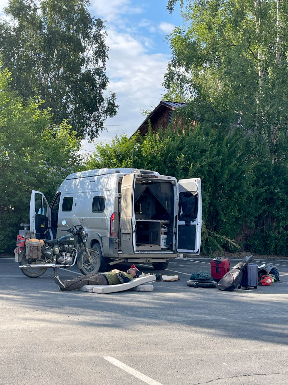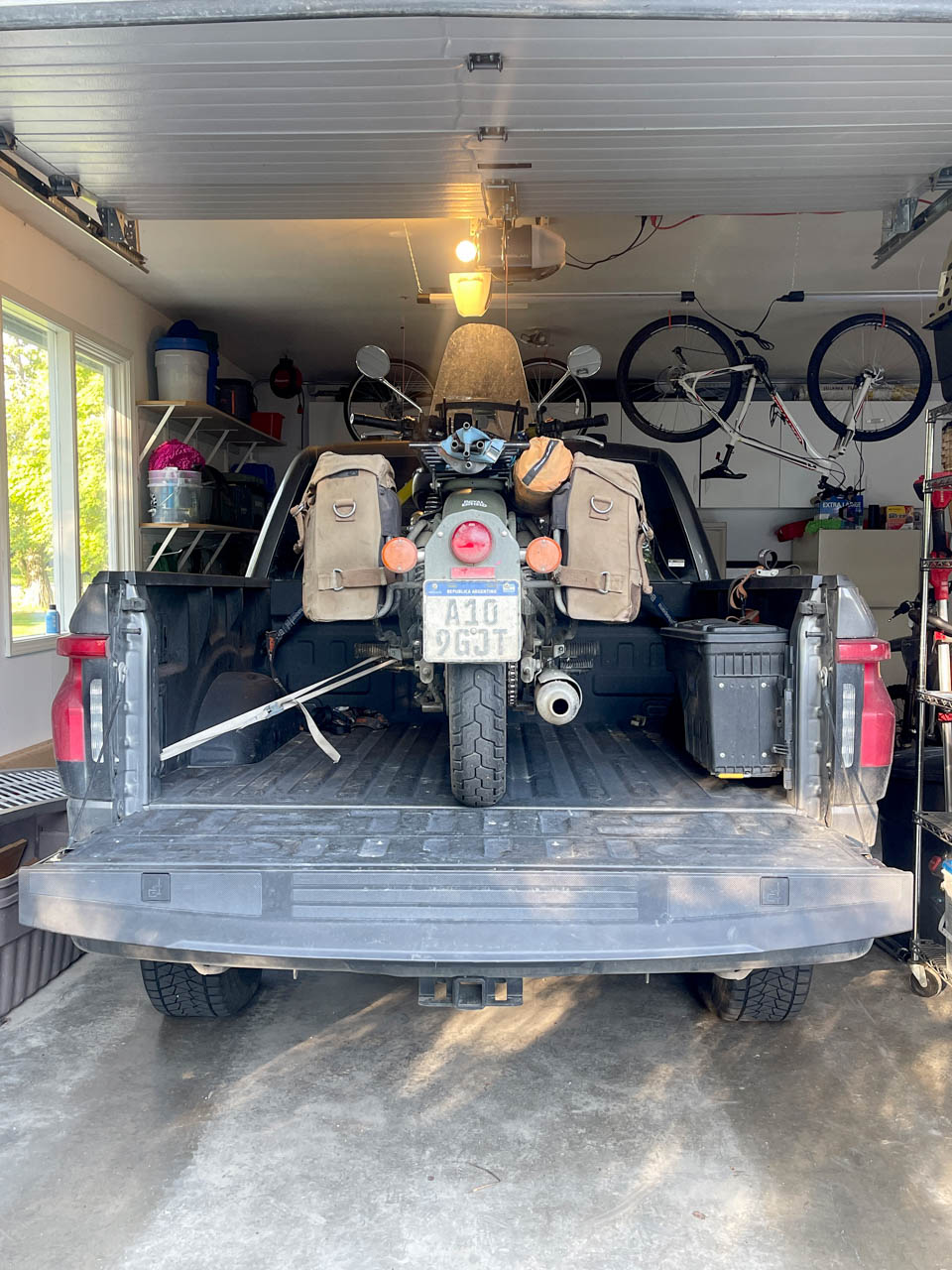 Morning light confirmed what I already knew: Frankie’s rear tire was flat. After riding more than 23,600 miles (38,000 kilometers), it didn’t feel like a disaster, just one more scar from the road. I inflated it with my portable compressor and found it held air long enough to move on. I decided Portland would be the place to fix it properly.