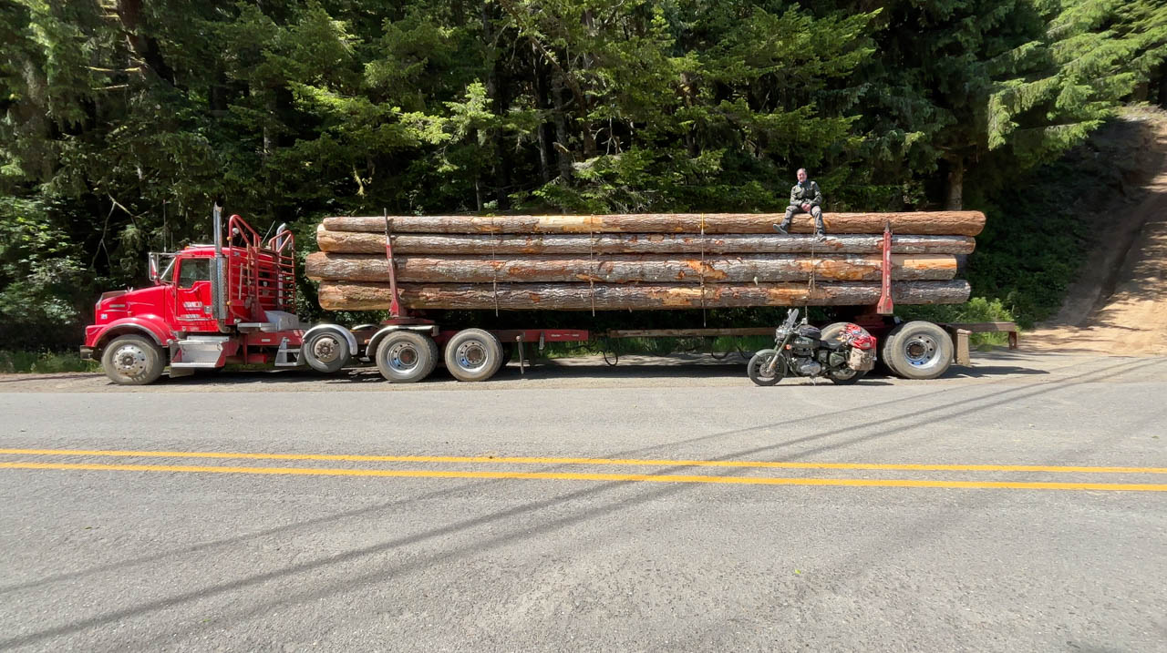 Oregon coast, soaking up the cliffs, beaches, and wild beauty. The ride east began slowly, barely 25 miles (40 kilometers) by midday, but it was packed with sights: a chainsaw sculpture park with an honesty box, massive Transformer-like logging trucks, and a cave attraction that promised sea lions but delivered a gift shop instead. You learn to enjoy the ride even when the payoff’s not what you expect.
