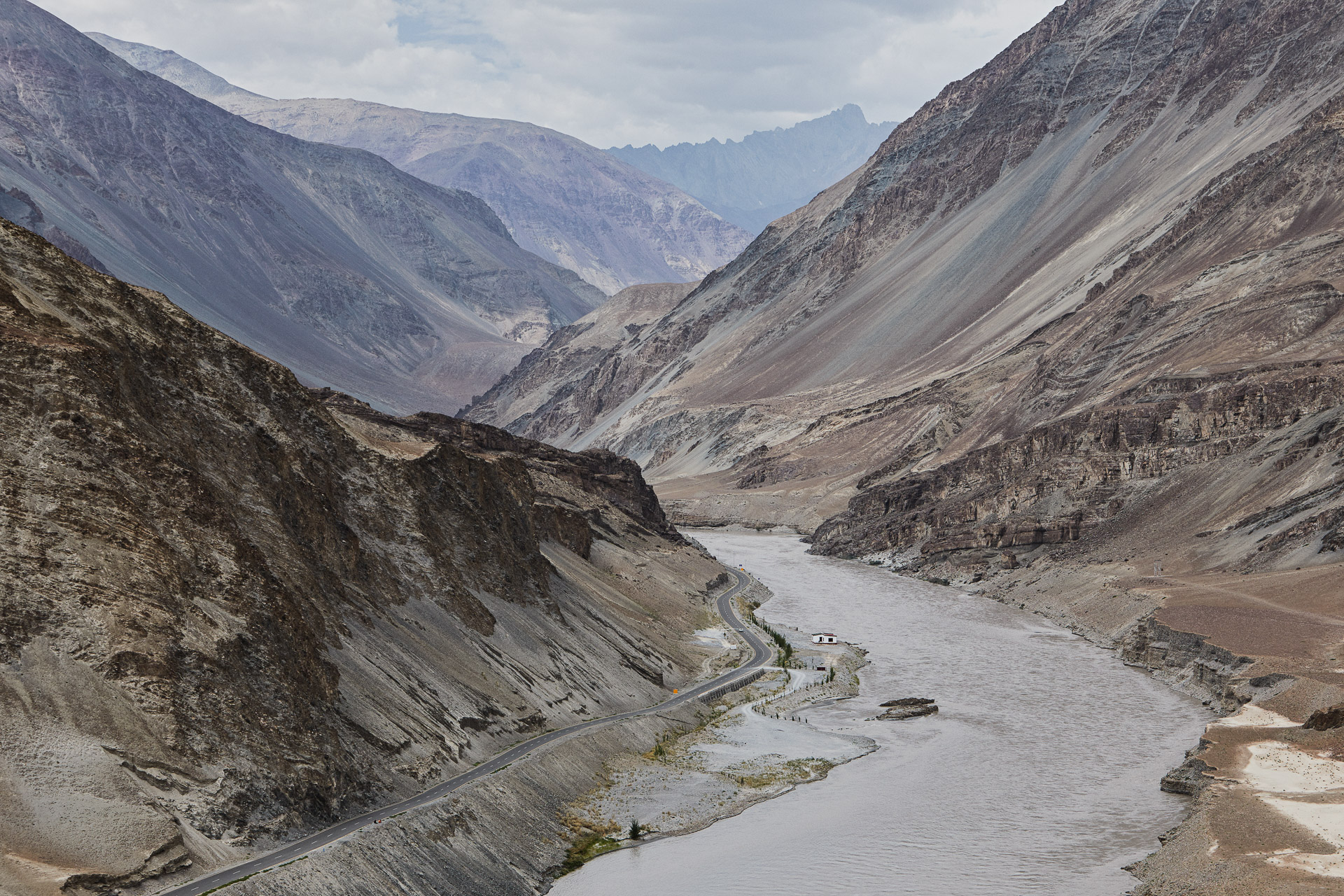But the valley itself couldn’t care less. Majestic, a grey, opaque, raging river flows through it. The current is so strong that it causes whirlpools and huge waves. The road overhangs and winds along the left bank. A crystalline blue torrent rushes down from the glaciers, fortifying the raging waves. A rapid change of colors. Grey wins out in a matter of moments.